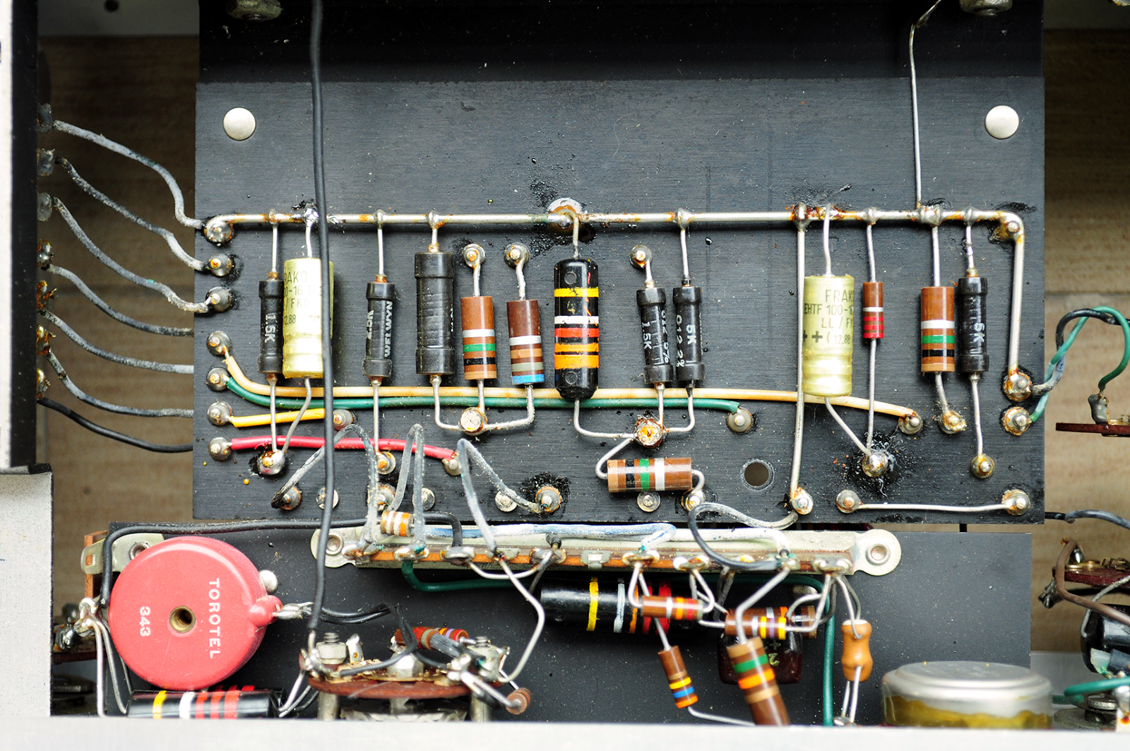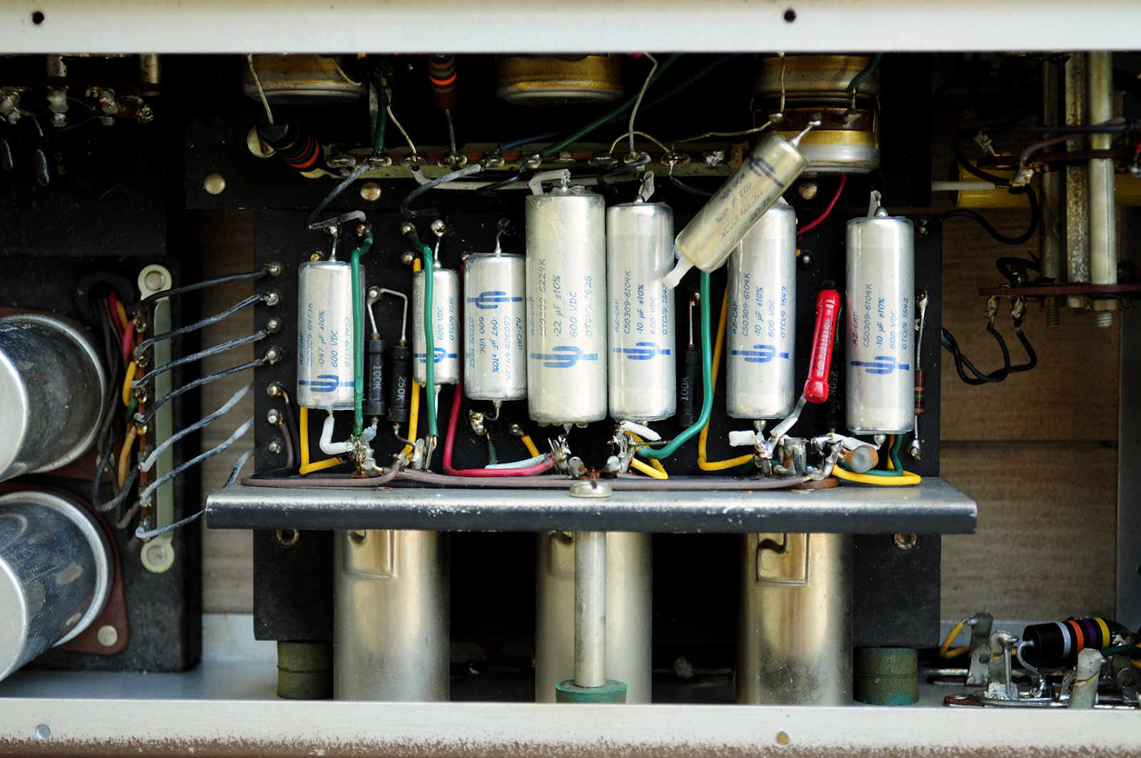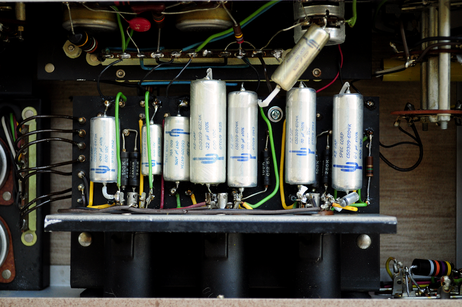 Top view for both channels of original with many Bumblebee “an easier to leak” capacitors.